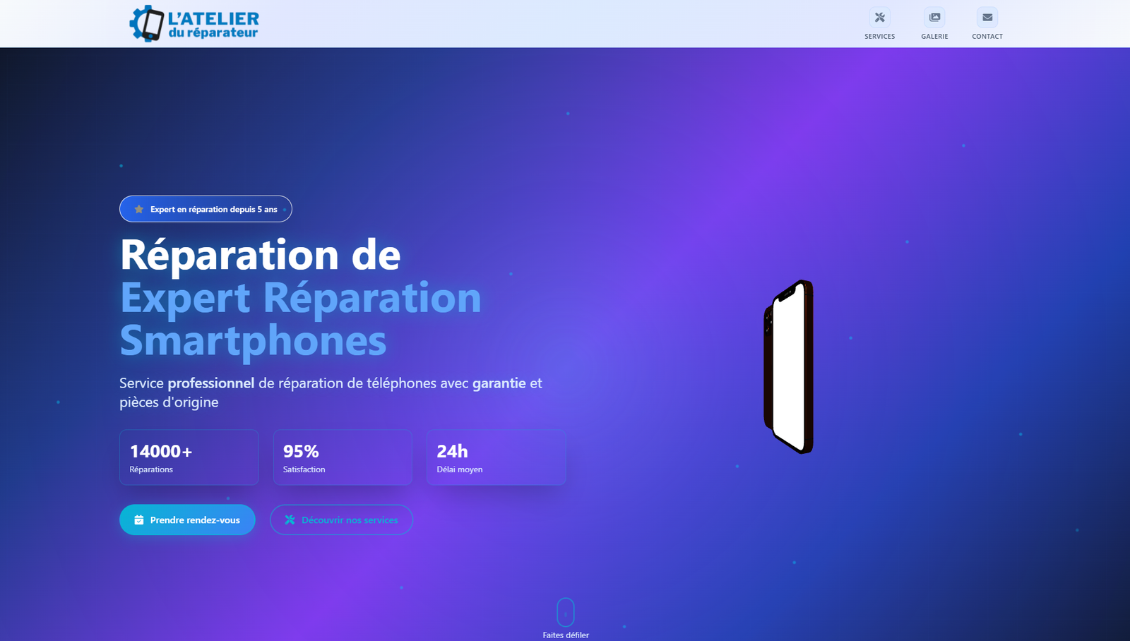 Création d'un site web moderne et responsive pour un Réparateur de téléphone . Design épuré mettant en valeur les photos, galerie interactive, formulaire de contact intégré. Et Tableau de bords pour la gestion des informations.