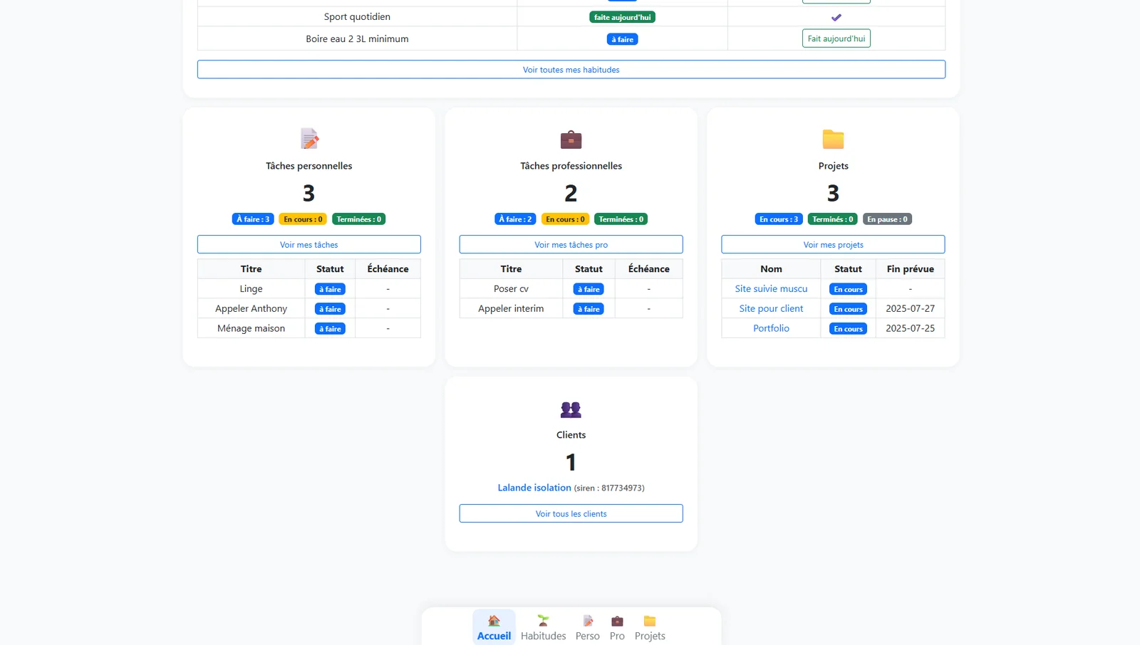 Développement d'une solution interne de gestion d'activité et de facturation automatisée. L'outil permet de générer des factures en quelques clics, de suivre l'état des paiements et de calculer automatiquement le chiffre d'affaires. Conçu spécifiquement pour simplifier ma gestion administrative quotidienne et me permettre de me concentrer sur mon cœur de métier.